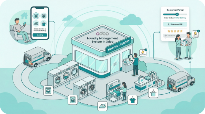 Odoo laundry service providers and staff with tools for order processing, scheduling, inventory management, and customer communication. It workflow processes, allowing staff to focus on delivering quality service and customer satisfaction.