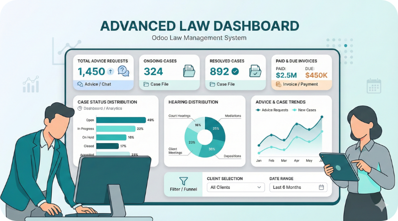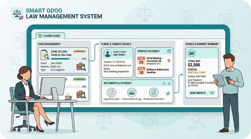 Odoo Law Management Software is a powerful solution tailored to the needs of law firms and legal professionals. It integrates case management, client communication, document management, billing, and legal operations features.