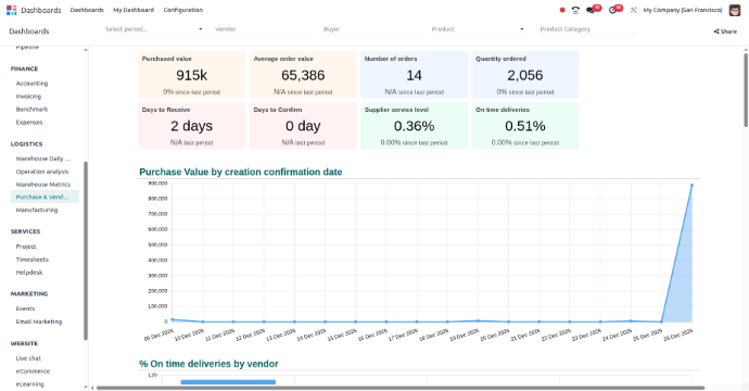 The Purchase Dashboard in Odoo shows all purchase information in one place. It helps you track buying activity, supplier performance, and make better purchase decisions in real time.