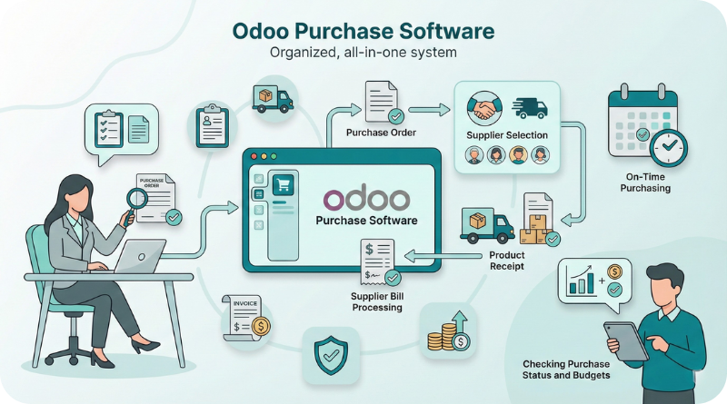 Odoo Purchase simplifies buying by managing orders, vendors, and stock updates in one place.