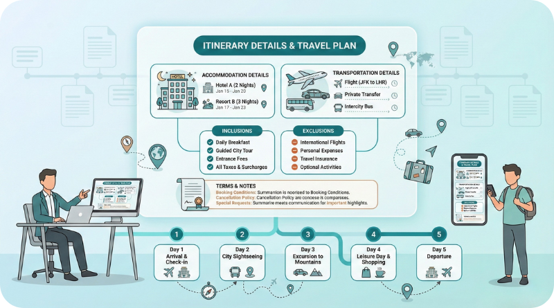 Your trip info's all laid out: where you're staying, how you're getting around, what's included (and what's not), and the fine print. It's all there in black and white, so you know exactly what to expect. No surprises - just a well-planned adventure waiting for you!