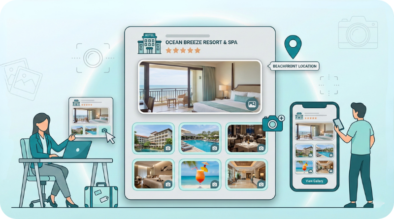 The tour and travel management software allows users to add photos of hotels to their attractiveness and provide visual insights to potential customers. This feature helps in showcasing the accommodation options effectively, influencing booking decisions positively